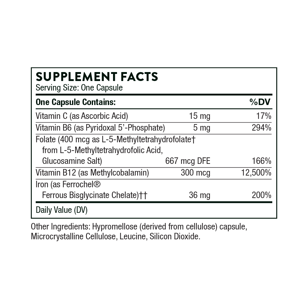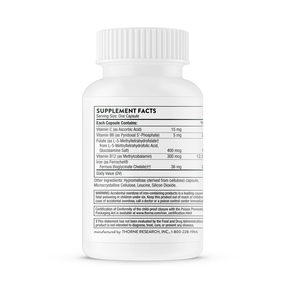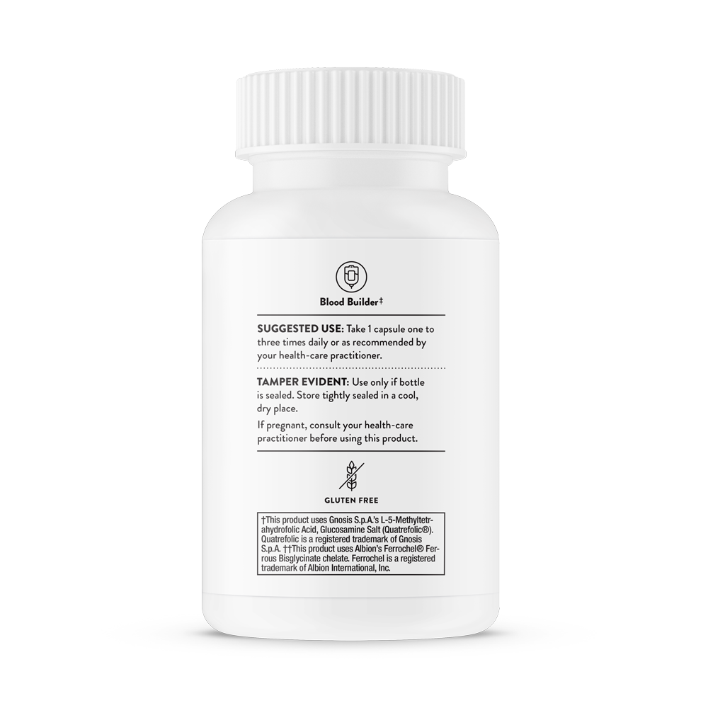 Iron deficiency can manifest as weakness, fatigue, shortness of breath on exertion, dizziness, tinnitus, spots before the eyes, drowsiness, irritability, infrequent menses, and loss of libido.* Individuals who have a greater need for iron, or who tend to chronically lose iron, or who don't absorb iron well, can benefit from a formula that can increase the amount of hemoglobin in the blood, such as Ferrasorb®.* Studies indicate that combining iron with essential B vitamins and vitamin C is superior to using these nutrients individually.* Ferrasorb combines the active forms of vitamin B6 (pyridoxal 5'-phosphate), vitamin B12 (methylcobalamin), and folate (L-5-methyltetrahydrofolate) with well-absorbed iron bisglycinate – for an optimal blood-building supplement.* Vitamin C is added to enhance iron's absorption.*