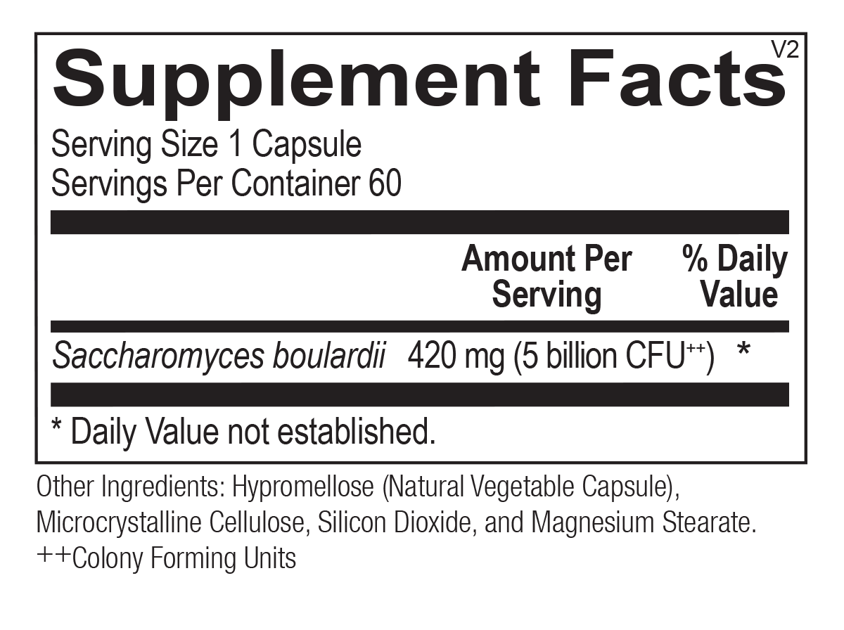 To be an effective probiotic, microorganisms must have certain qualities to withstand the natural defense factors of the host. This includes resistance to gastrointestinal transit (enzymes, bile salts, organic acids and pH fluxes) and the ability to thrive at human core temperatures. This formulation of Saccharomyces boulardii is a stomach acid-resistant probiotic, proven to survive high temperatures and transit into the intestines. Each capsule includes 5 billion colony forming units of the probiotic yeast. The formula is freeze-dried, lactose-free and strain-verified through genetic typing to ensure maximum efficacy.